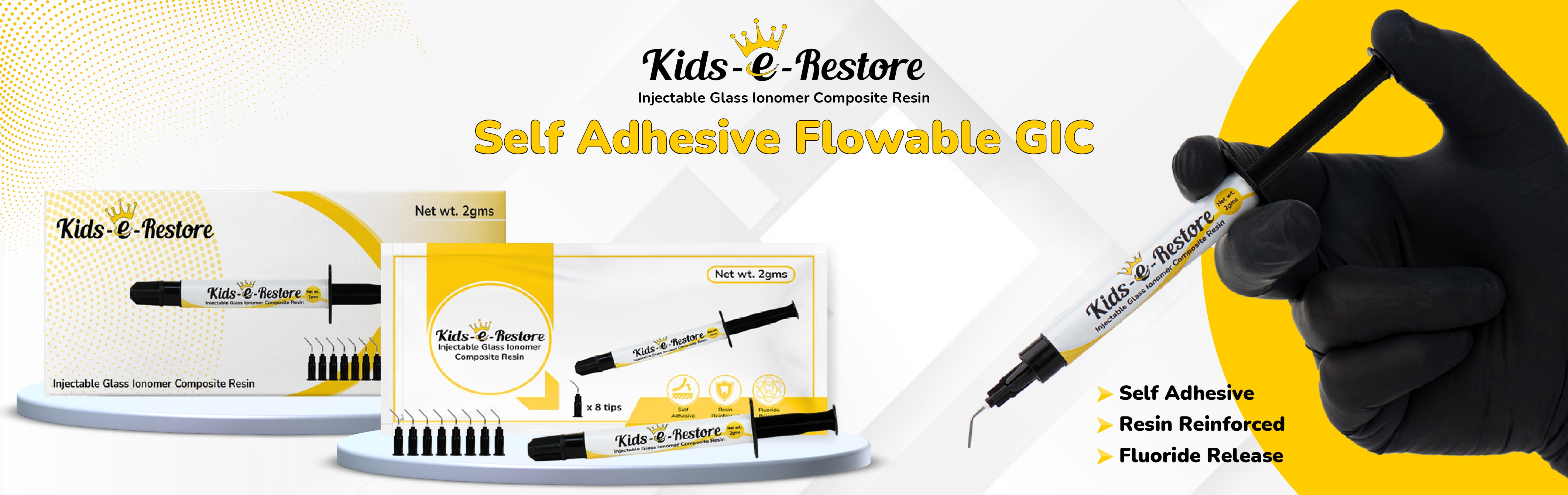 Kids-e-Restore is a self-adhesive, light-cured, flowable, and ready-to-use-resin-reinforced glass ionomer restorative. With excellent tooth adhesion, sustained fluoride release, and ease of use, Kids-e-Restore is suitable for a wide range of restorative applications.